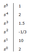 Total number of roots is 5. Since two sign changes in first column, two roots are in right half plane.