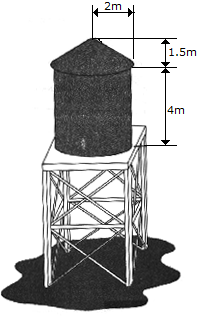 Determine the approximate amount of paint needed to cover the surface of the water storage tank. Assume that a liter of paint covers 2.5 m2. Also, what is the total inside volume of the tank.