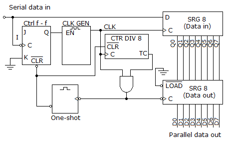 The divide-by-8 counter is triggered by the control flip-flop and clock, which then allows the data output register to begin storing the input data. Once all eight data bits are stored in the data output register, the data output register and the divide-by-8 counter trigger the one-shot. The one-shot then begins the process all over again.