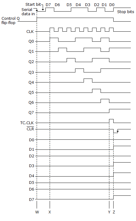 After counting the eight data bits, the divide-by-8 counter produces an output on its active-LOW CLR line to reset the Control FF.
