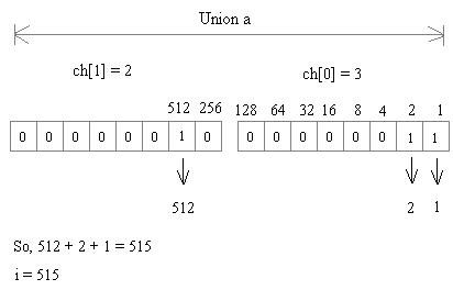 printf("%d, %d, %d\n", u.ch[0], u.ch[1], u.i); It prints the value of u.ch[0] = 3, u.ch[1] = 2 and it prints the value of u.i means the value of entire union size.