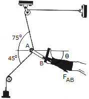 Determine the magnitude and direction of the resultant force FAB exerted along link AB by the tractive apparatus shown. The suspended mass is 10 kg. Neglect the size of the pulley at A.