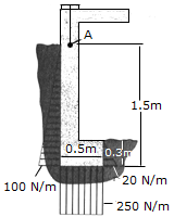 The distributed loadings of soil pressure on the sides and bottom of a spread footing are shown. Simplify this system to a single resultant force and couple moment acting at A. What is the resultant force F and the couple moment M?