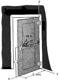 A force of 50 N is applied to the handle of the door as shown. Determine the projection of the moment of this force about the hinged axis z. Neglect the size of the doorknob. Suggestion: Use a scaler analysis.