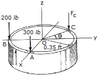 Three parallel forces act on the rim of the tube. If it is required that the resultant force FR of the system have a line of action that coincides with the central z axis, determine the magnitude of FC and its location on the rim. What is the magnitude of the resultant force FR?