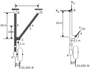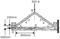 A force of 500 N acts at the top of the two-member frame. If the members are in smooth contact with one another at A, B, and C with no fasteners, determine the shear force developed at a horizontal section through point D of the support. Also, what are the axial force, shear force and moment at point E?