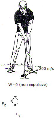 A golf ball having a mass of 40 g is struck such that it has an initial velocity of 200 m/s as shown. Determine the horizontal and vertical components of the impulse given to the ball.