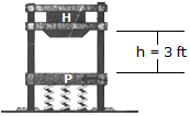 The drop hammer H has a weight of 900 lb and falls from rest. H has a weight of 900 lb and falls from rest h = 3 ft onto a forged anvil plate P that has a weight of 500 lb. The plate is mounted on a set of springs which have a combined stiffness of kT = 500 lb/ft. Determine (a) the velocity of P and H just after collision and (b) the maximum compression in the springs caused by the impact. The coefficient of restitution between the hammer and the plate is e = 0.6. Neglect friction along the vertical guide posts A and B.