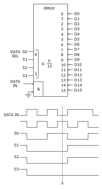 The device shown in below is a ________ and for the waveforms shown in the accompanying diagram, the ________ output at point X will be ________ and all others will be ________.
