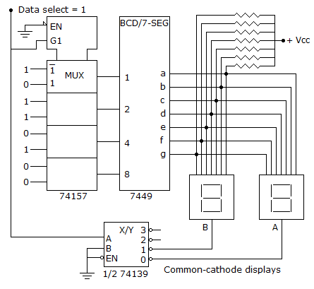 For the input values (A0–A3, B0–B3, Data Select = 1) given for the circuit given below, what will be indicated on the displays?