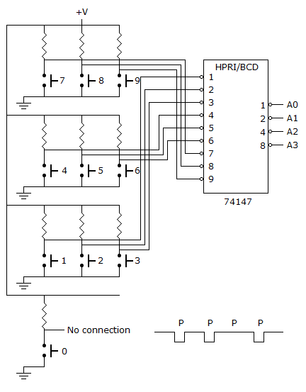Refer to the keyboard encoder in figure (a). Sometimes when the 5 key is pressed, the system attached to the keypad does not respond. The 5 input on the 74147 is monitored with a digital storage scope while repeatedly pressing the 5 key, and the waveform in figure (b) is obtained; the P above the trace indicates the points at which the technician pressed the key. What is most likely wrong with the circuit?