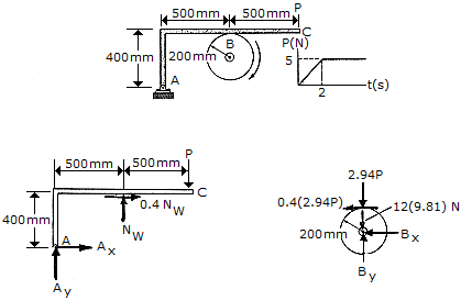 The 12-kg disk has an angular velocity of = 20 rad/s. If the brake ABC is applied such that the magnitude of force P varies with time as shown, determine the time needed to stop the disk. The coefficient of friction at B is = 0.4.