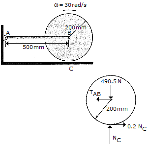 The 50-kg cylinder has an angular velocity of 30 rad/s when it is brought into contact with the horizontal surface at C. If the coefficient of friction is c = 0.2, determine how long it takes for the cylinder to stop spinning. What force is developed at the pin A during this time? The axis of the cylinder is connected to two symmetrical links. (Only AB is shown.) For the computation, neglect the weight of the links.